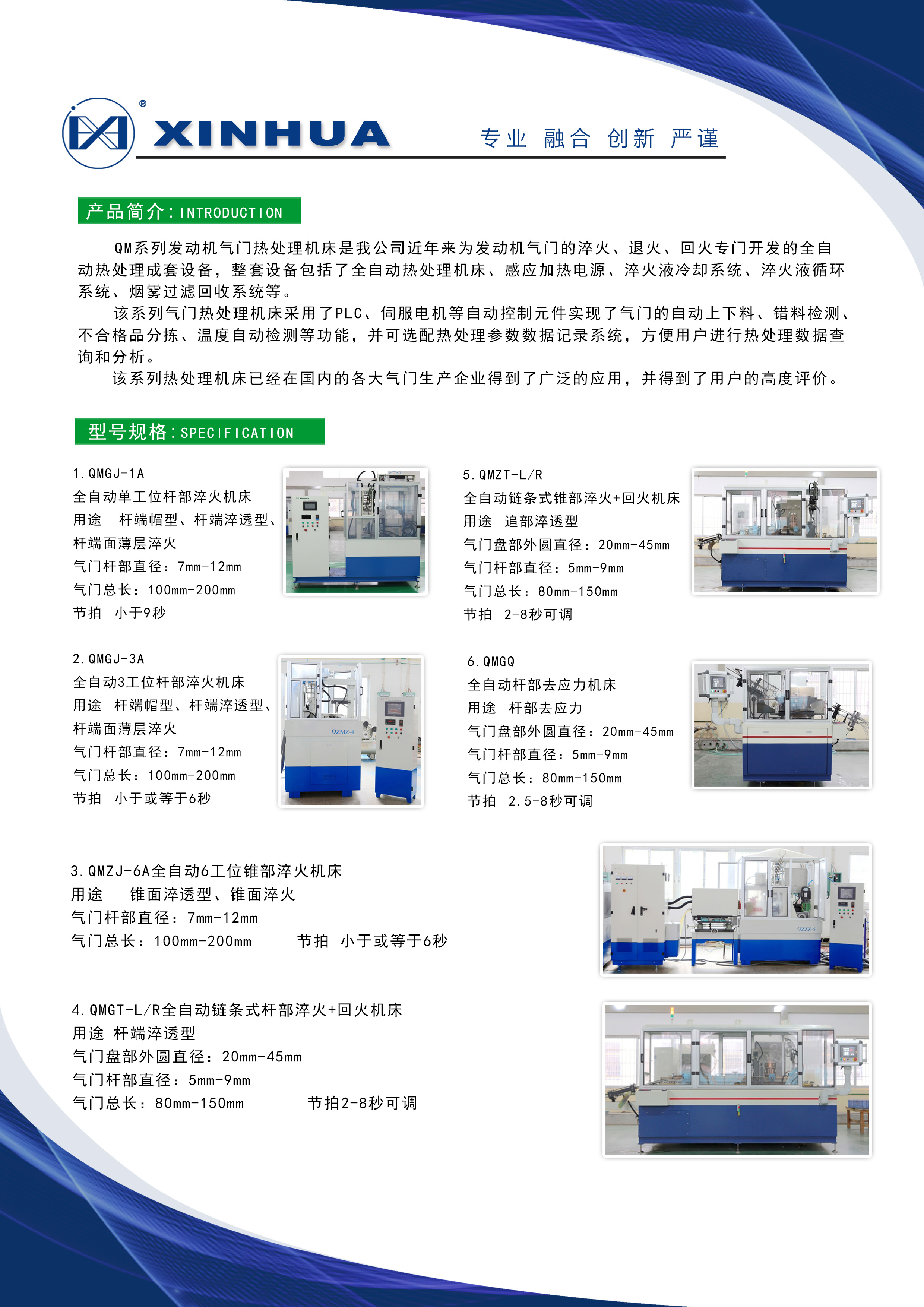 QM系列發(fā)動機氣門熱處理機床是我公司近年來為發(fā)動機氣門的淬火、退火、回火專門開發(fā)的全自動熱處理成套設(shè)備,整套設(shè)備包括了全自動熱處理機床、感應(yīng)加熱電源、淬火液冷卻系統(tǒng)、淬火液循環(huán)系統(tǒng)、煙霧過濾回收系統(tǒng)等。